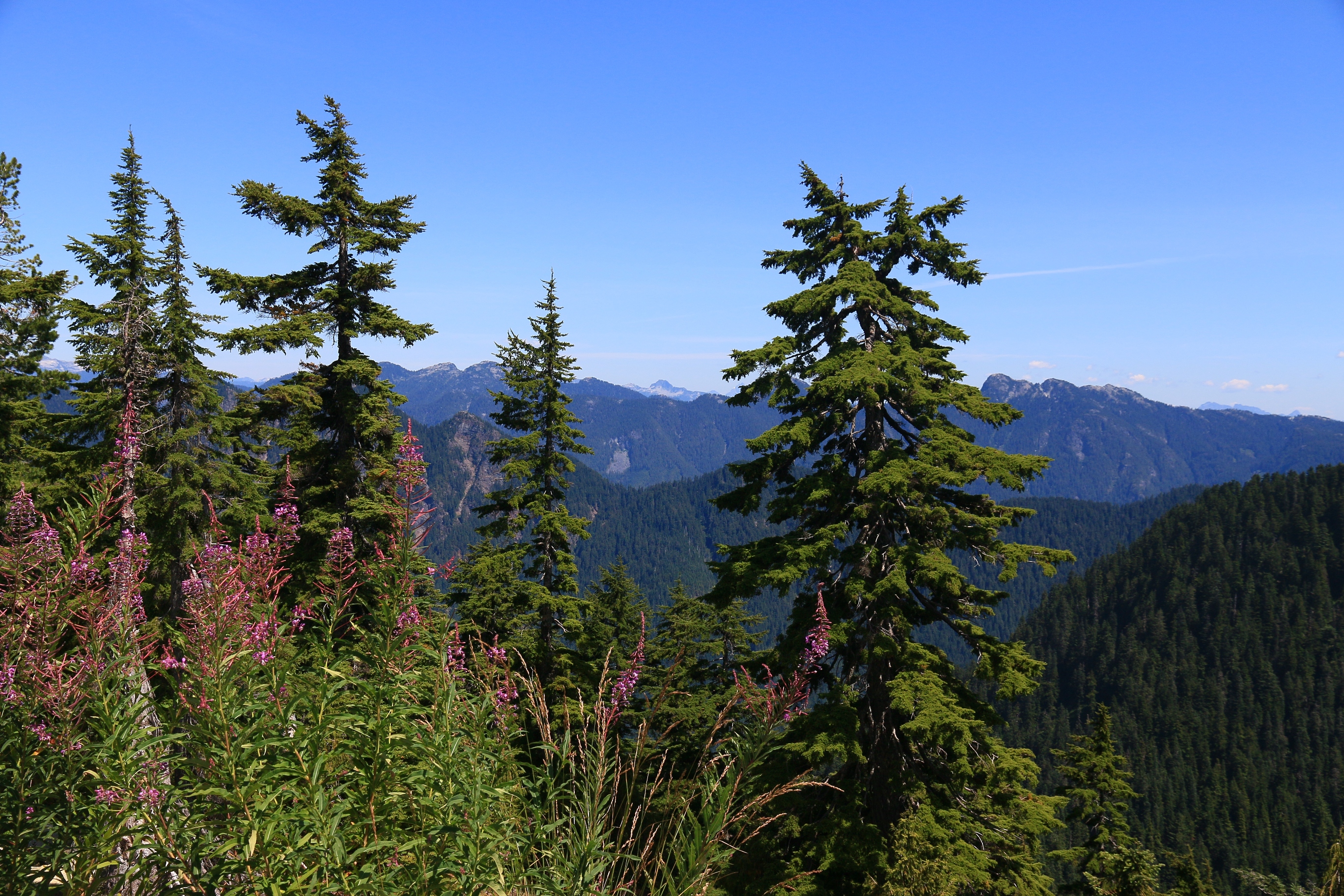 I had such a good time with a bike I almost considered doing it again the next day – my last in Vancouver. In the end I took the public transport option, crossing by ferry to North Vancouver and trundling by bus through the leafy suburbs climbing up to the base of Grouse Mountain. From here a far more expensive gondola transports you up to a world of mountain meadows and pines, fancy restaurants, ziplines and kitsch lumberjack shows. There are few longer trails on which to escape, but the views are there to be had. I can see the United States of America, most prominently in the form of Mount Baker, and my proximity to a previous travel adventure hits home. Meanwhile to the north and west, the mountains roll on, a reminder of the sparseness of this land, while the city of Vancouver shimmers many hundreds of metres below behind my back.